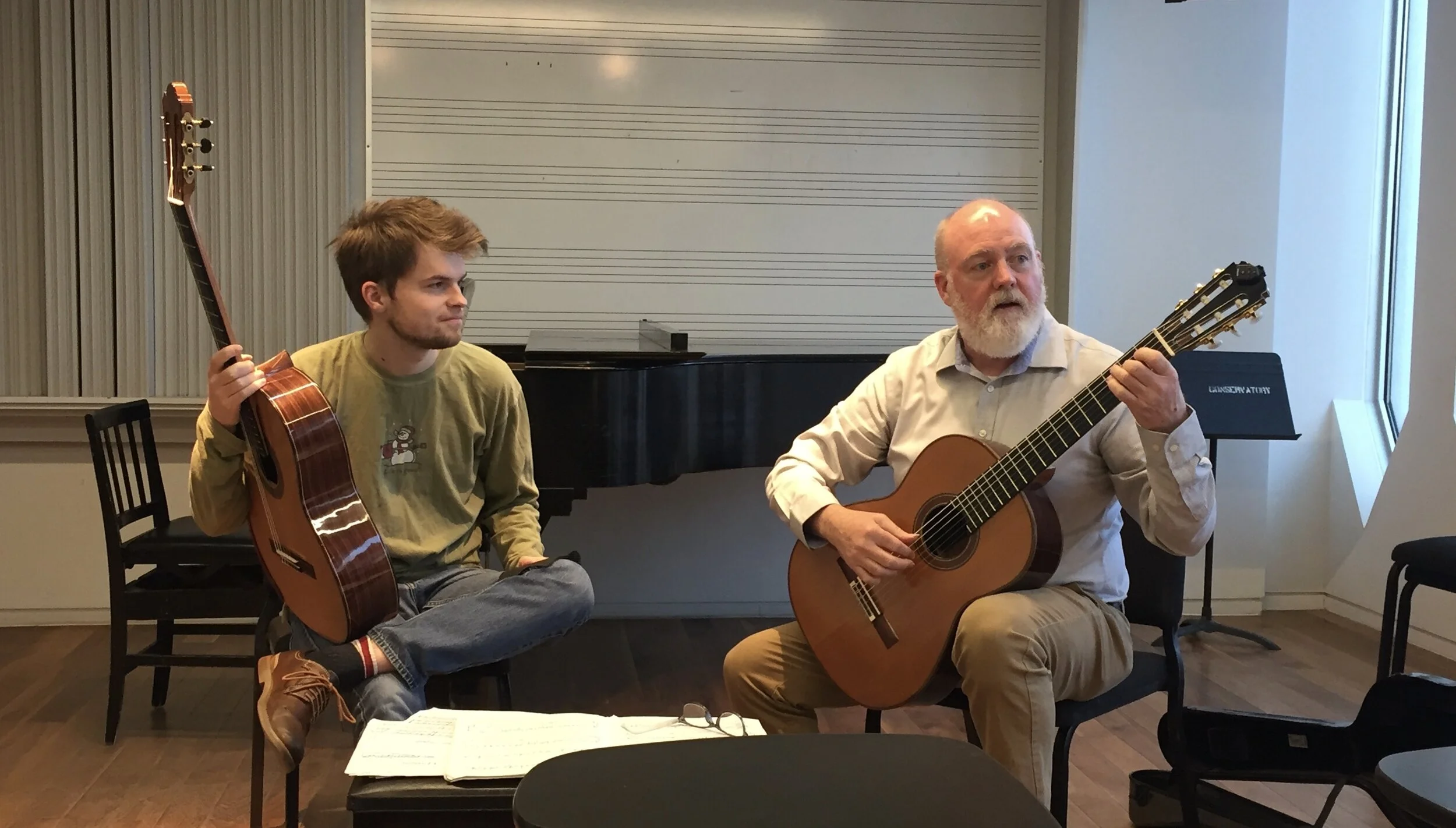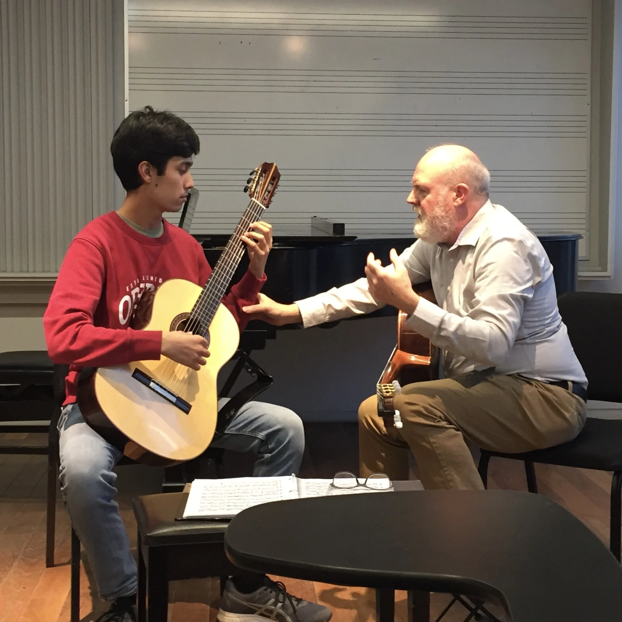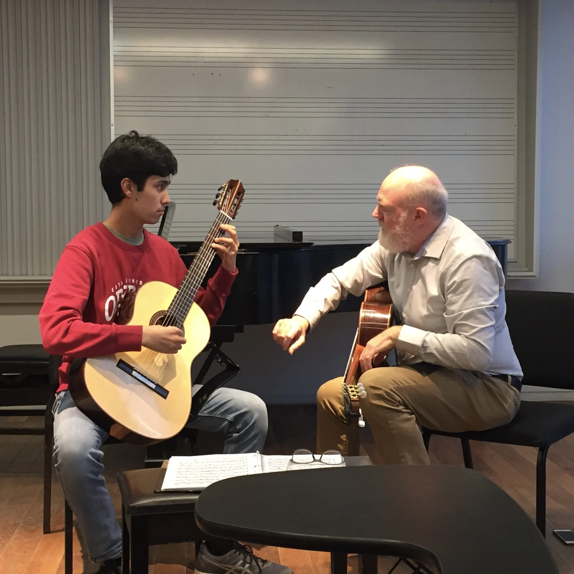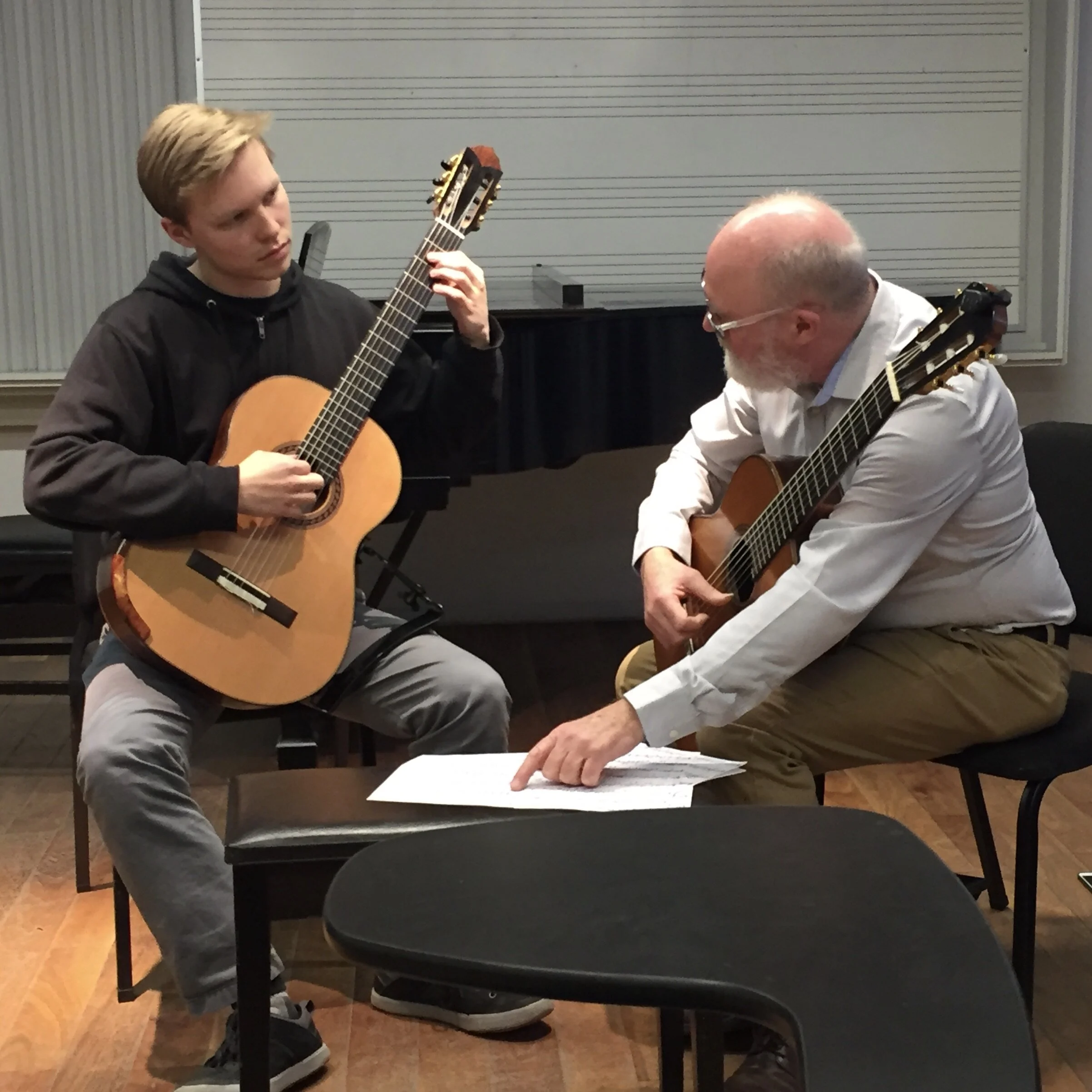 James Marron is Classical Guitar Teacher at The University of Akron. He has been the Guitar Department Head and sole classical guitar teacher since my retirement there in 2015. Prior to that, he was a member of the guitar faculty along with me, at U Akron since 1991, when he finished his MM there. He has recorded, toured, composed and published, and taught for many years from his perch in Akron, Ohio, and he has been a close friend to me for over 30 years. So, it was my great pleasure to bring him over to Oberlin for a meeting with some of my students. Four students played for him, and we were treated to discussions about technique and practicing, warming up, tone production, interpretation, balance and many other related subjects of interest to us all. Here are some shots from the class:
