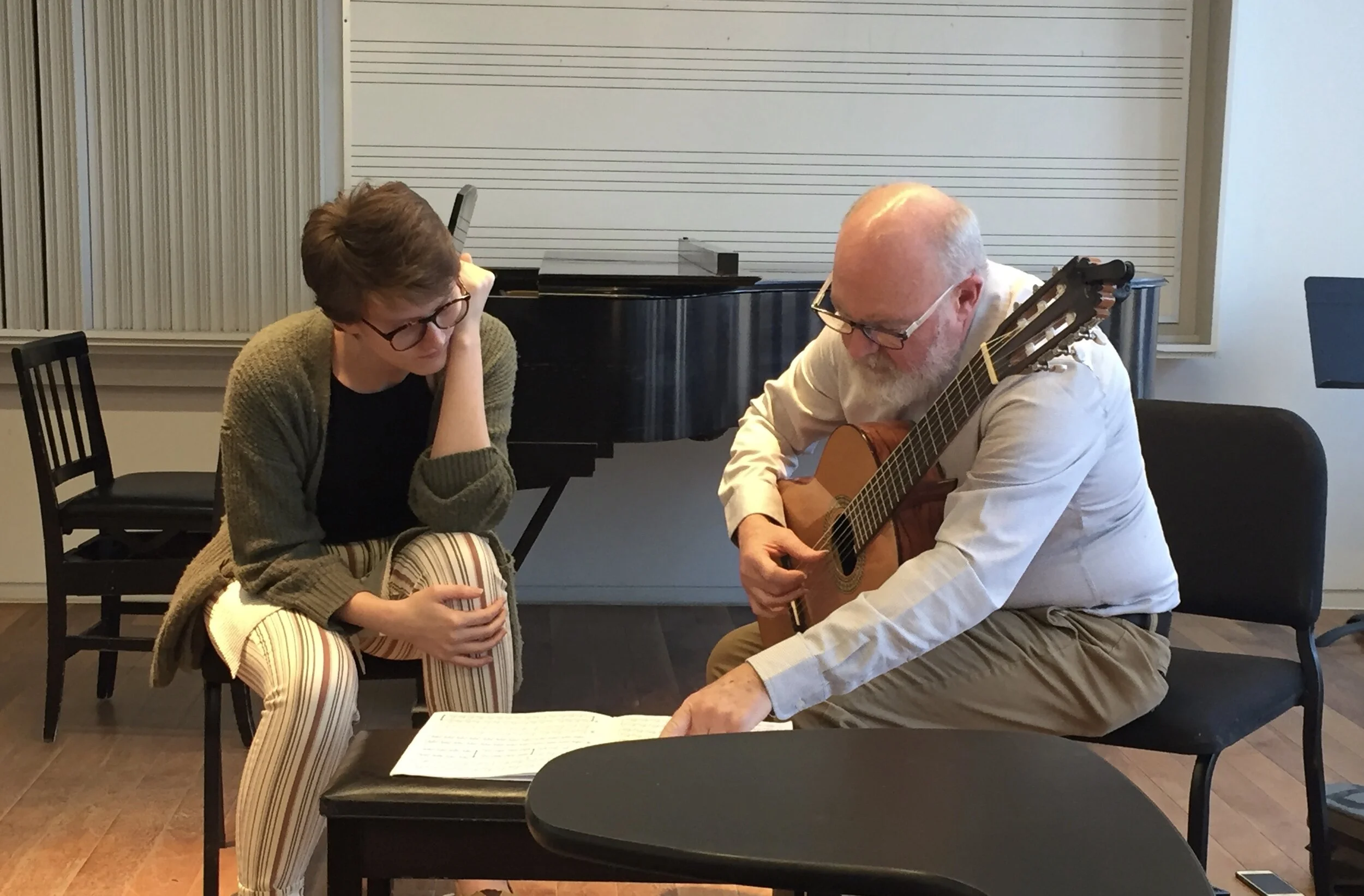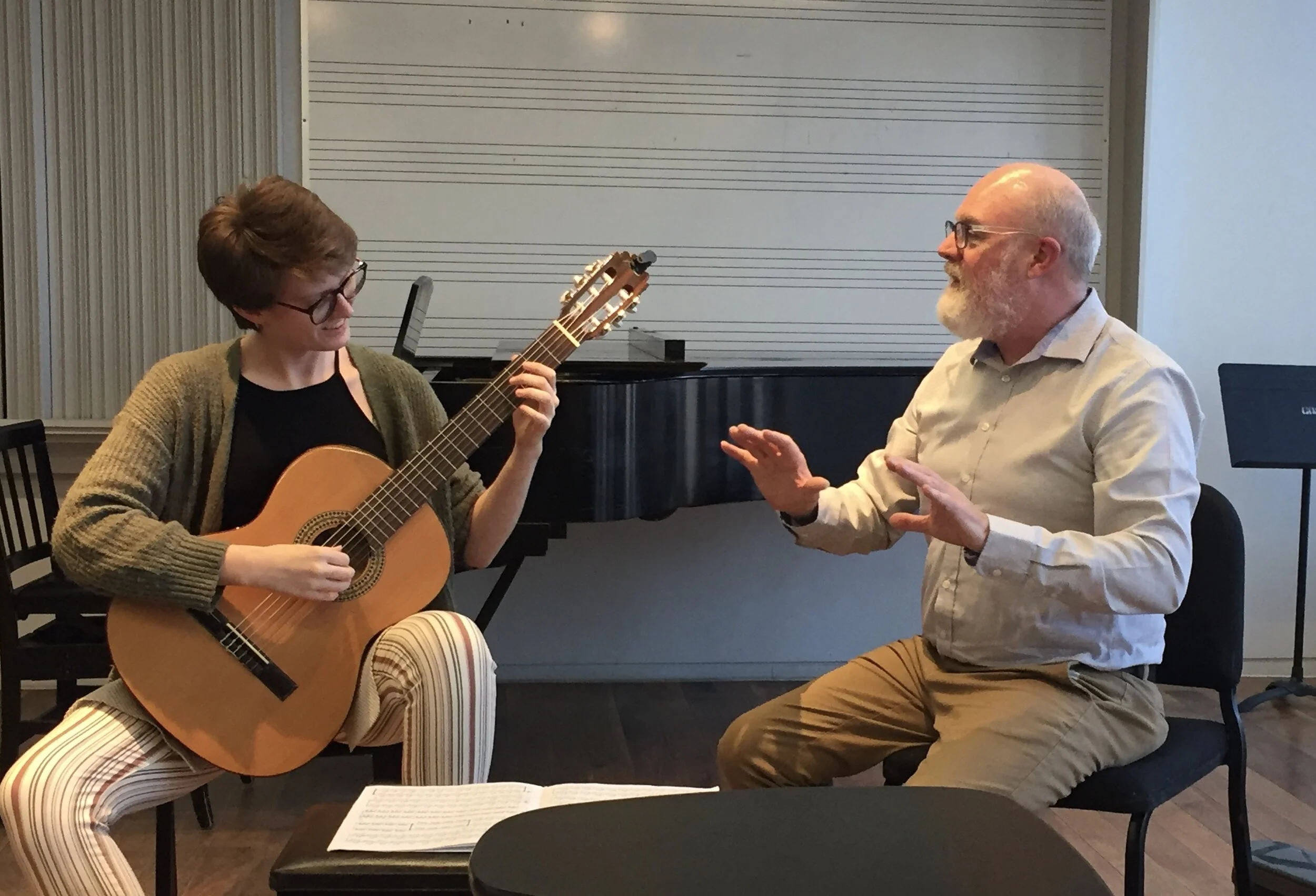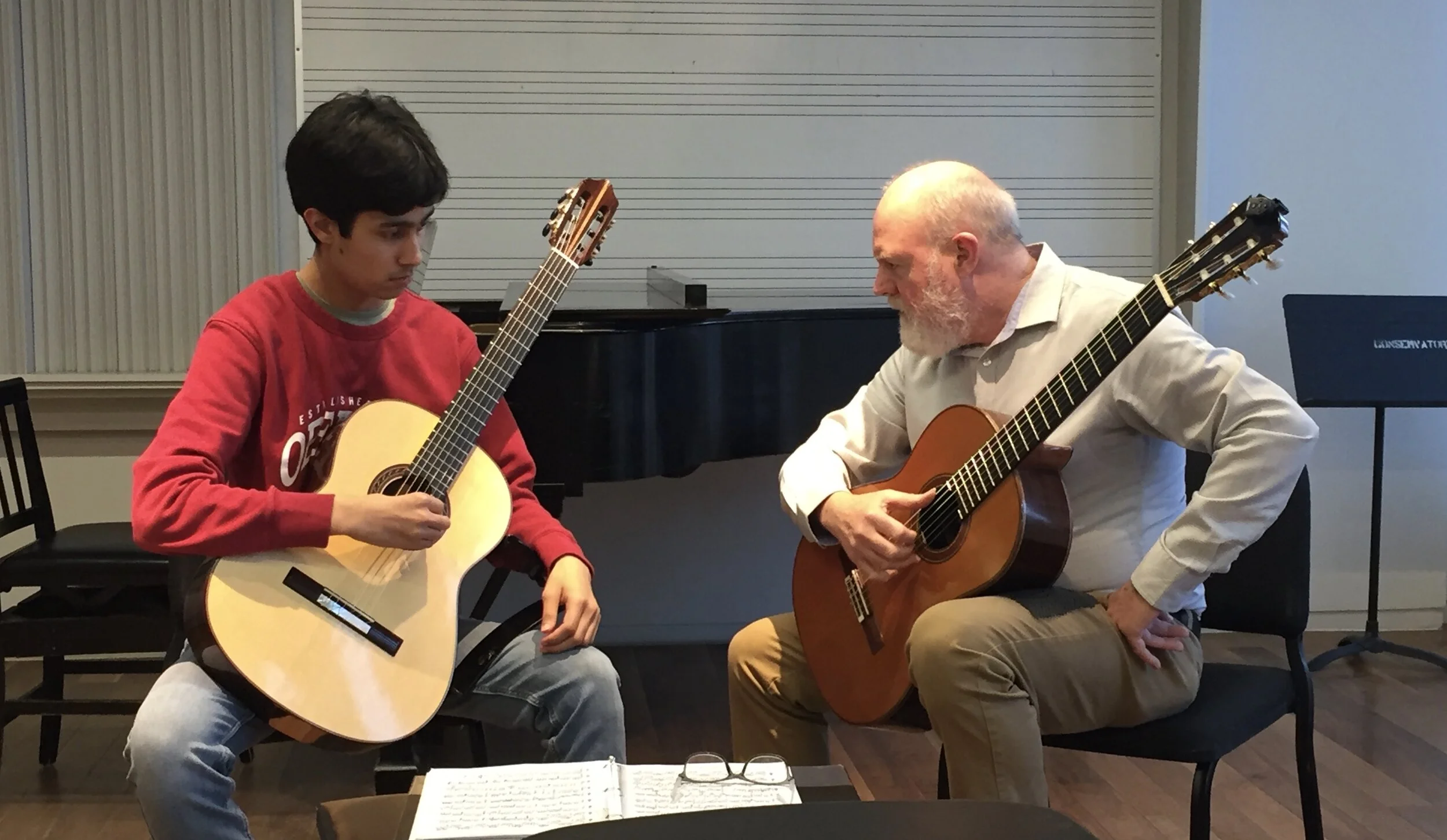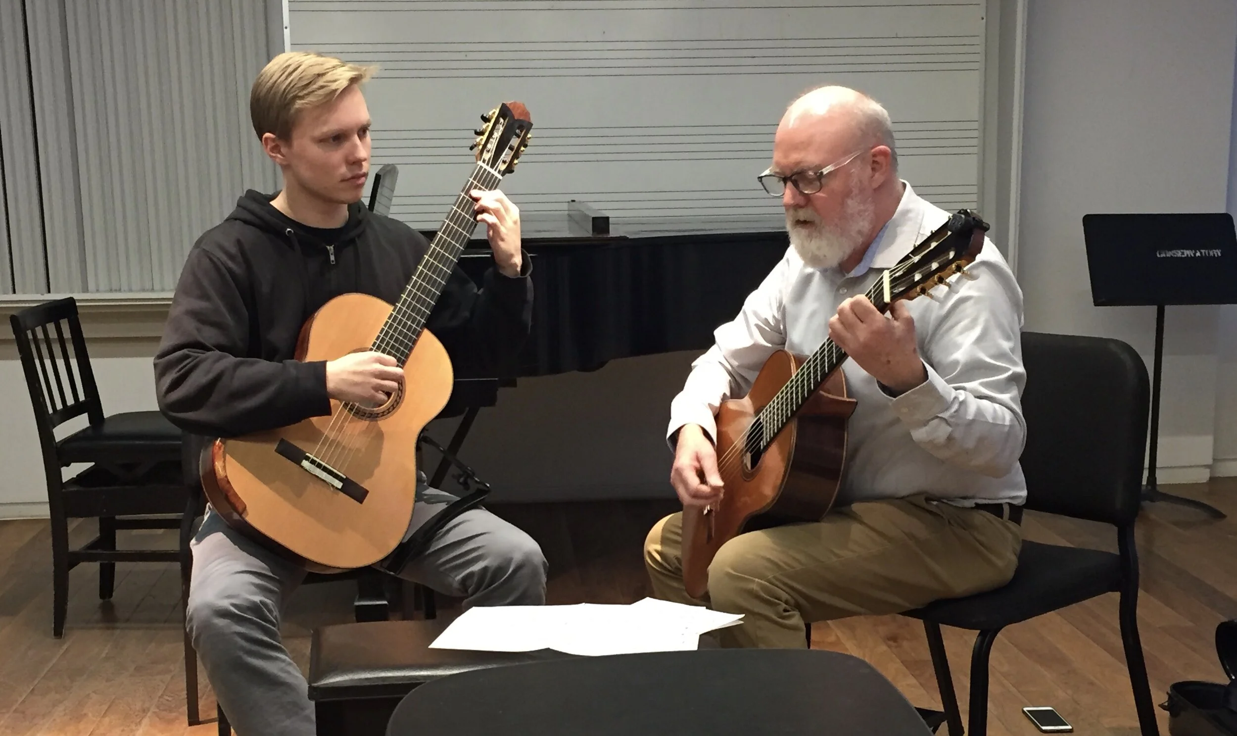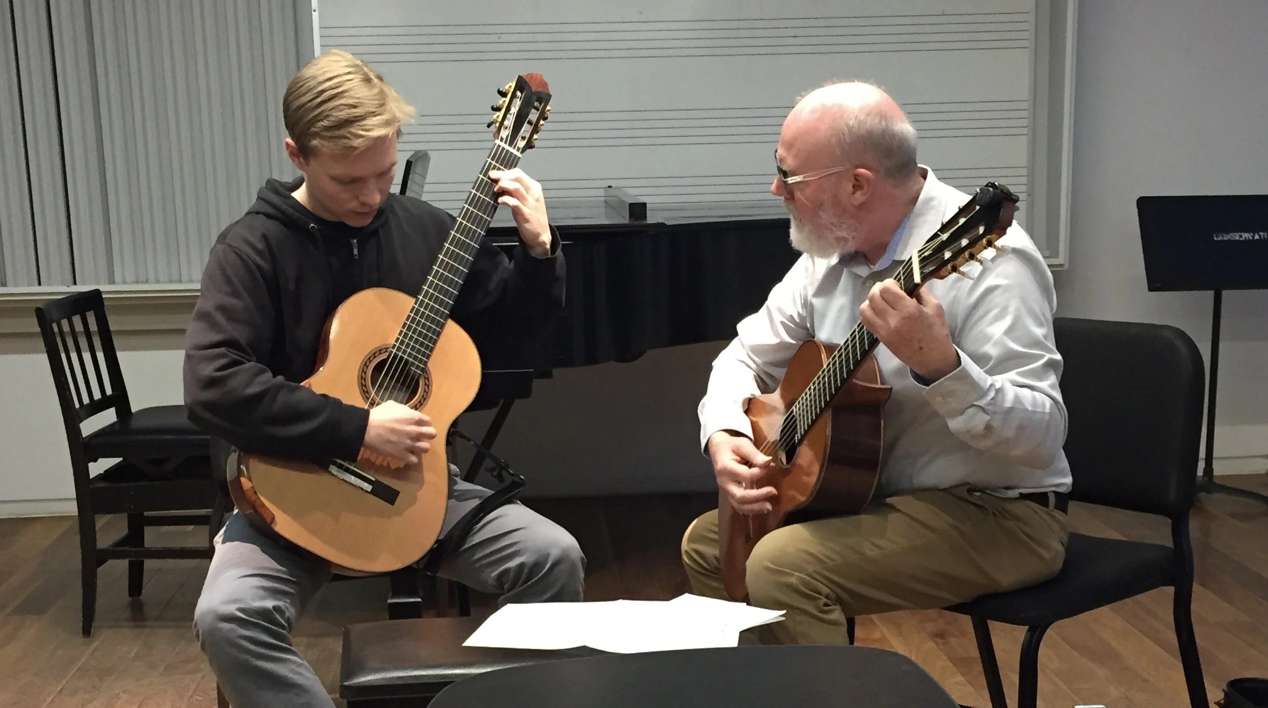 James Marron is Classical Guitar Teacher at The University of Akron. He has been the Guitar Department Head and sole classical guitar teacher since my retirement there in 2015. Prior to that, he was a member of the guitar faculty along with me, at U Akron since 1991, when he finished his MM there. He has recorded, toured, composed and published, and taught for many years from his perch in Akron, Ohio, and he has been a close friend to me for over 30 years. So, it was my great pleasure to bring him over to Oberlin for a meeting with some of my students. Four students played for him, and we were treated to discussions about technique and practicing, warming up, tone production, interpretation, balance and many other related subjects of interest to us all. Here are some shots from the class: